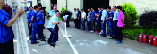 随后、行政部副经理就火灾报警、紧急疏散、火灾现场逃生、如何自救等事项做了详细的讲解和说明,并对如何使用手提式干粉灭火器、消防水带等消防器材进行了模拟实战演练,整个活动过程井然有序,员工参与热情高涨,随后,制造中心总经理对演练活动情况进行了点评。