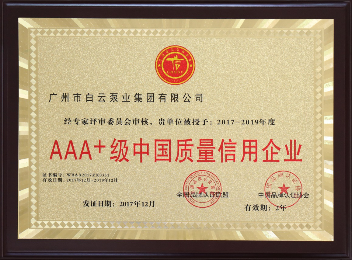 2017年12月,经全国品牌认证联盟、中国品牌认证协会专家评审委员会审核,被授予2017-2019年度“AAA+级中国质量信用企业”。